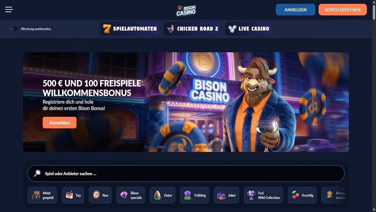 Nach ausführlichen Tests über mehrere Wochen kann ich Bison Casino eine positive Bison Casino Bewertung geben. Ich war besonders beeindruckt vom großzügigen Willkommensbonus mit fairen Umsatzbedingungen, dem exklusiven VIP-Programm und der umfangreichen Spielauswahl von renommierten Software-Herstellern. Die moderne Webseite mit exzellenter mobiler Optimierung, die vielfältigen Zahlungsmethoden und das zusätzliche Freunde-werben-Programm rundeten mein positives Gesamtbild ab.