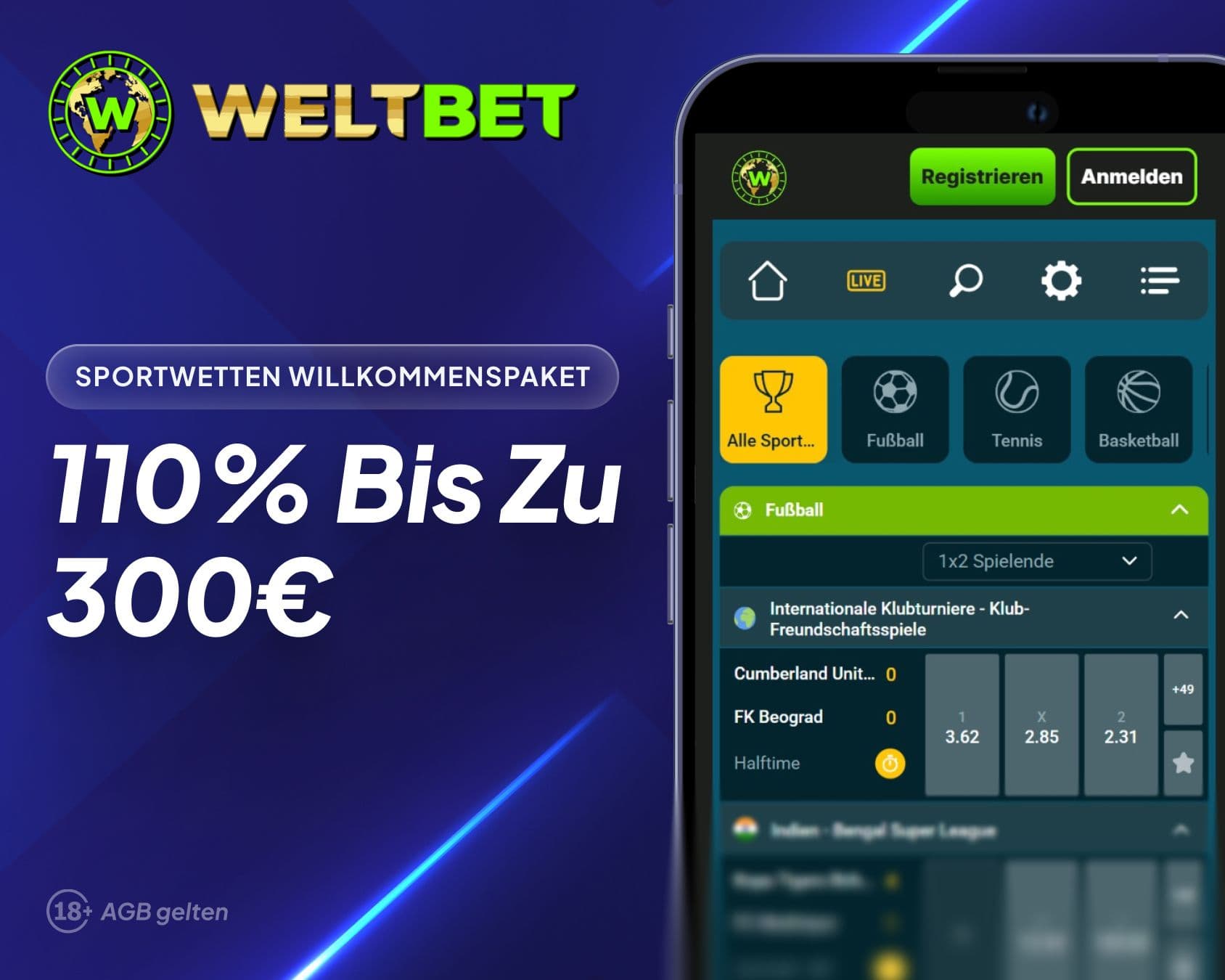 - Bonushöhe: 110% bis zu €300 (Sportwetten)
